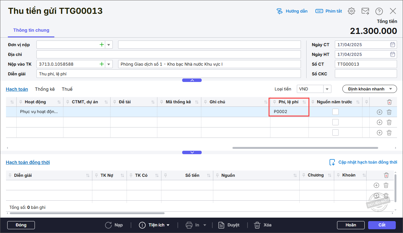 - Chọn thông tin phí, lệ phí tương ứng tại cột Phí, lệ phí cho dòng hạch toán đã nhập. Sau đó nhấn Cất. (Nếu làm thu tiền mặt thì nhấn vào tab Thống kê sẽ thấy cột Phí, lệ phí)
