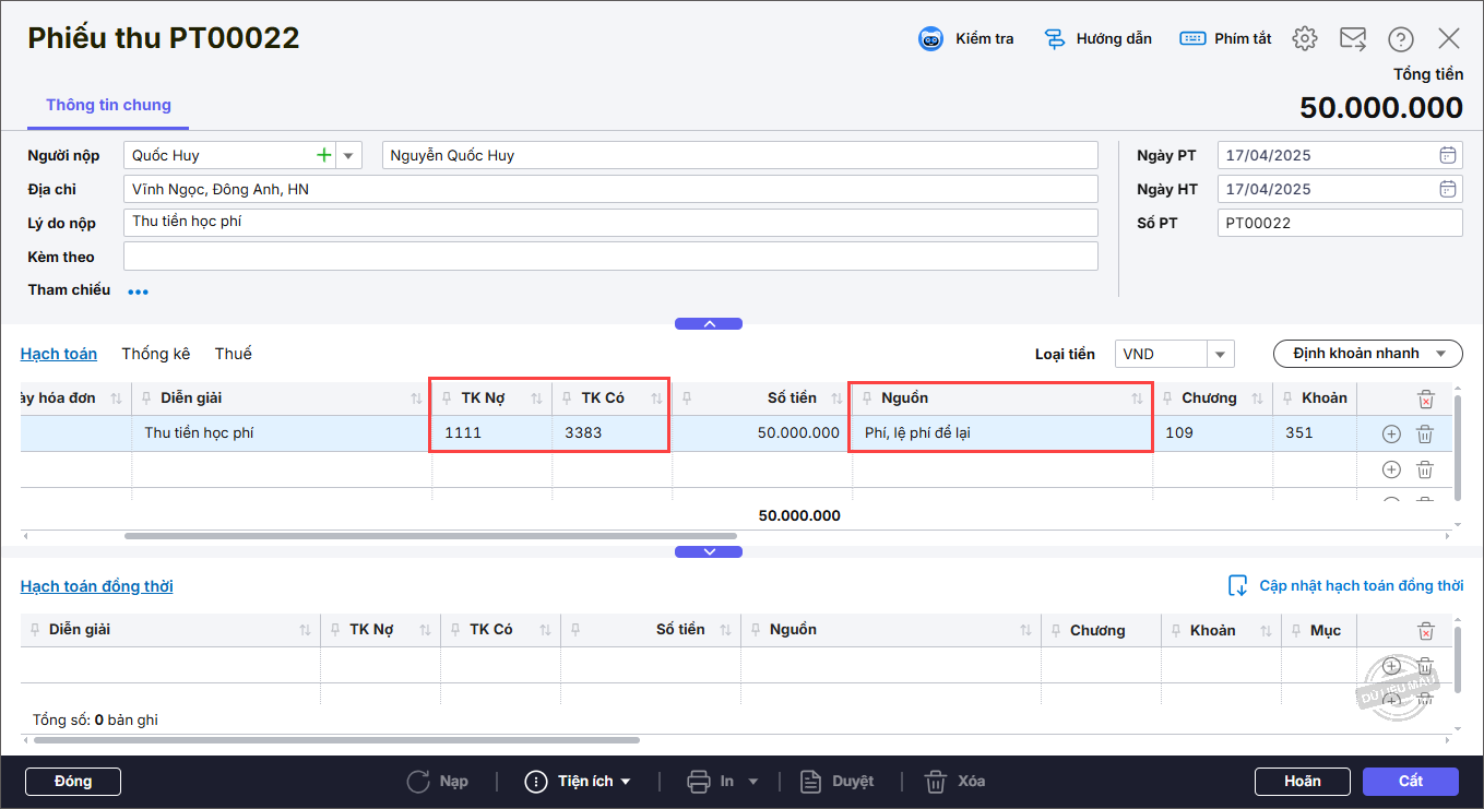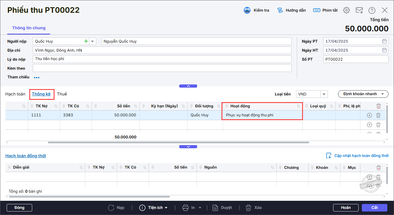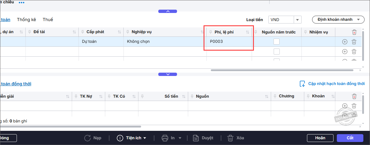 • Chọn thông tin Phí, lệ phí cho dòng hạch toán đã nhập. Sau đó nhấn Cất.
