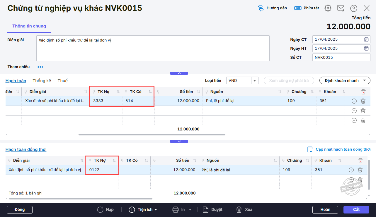 Bước 4. Khi xác định được số phí, lệ phí được khấu trừ, để lại tại đơn vị, vào nghiệp vụ Tổng hợp\Chứng từ nghiệp vụ khác, hạch toán: