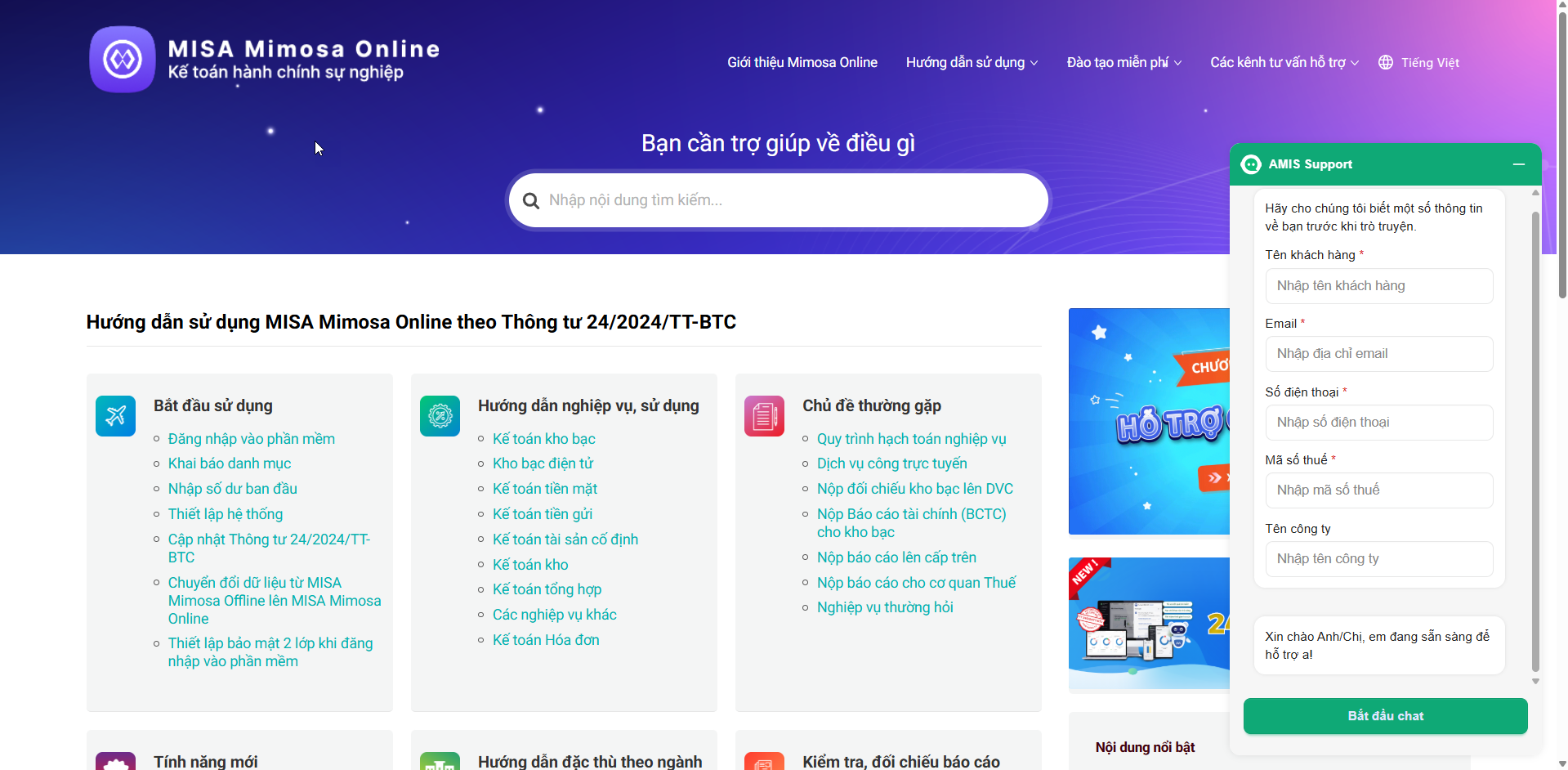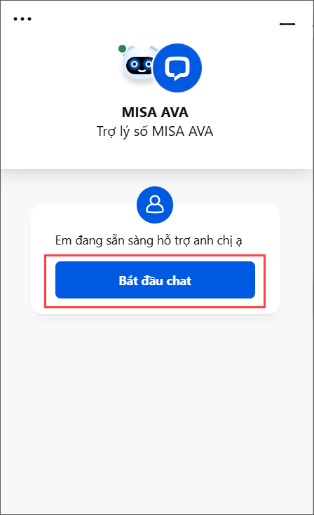 Bước 2: Phần mềm xuất hiện hộp thoại chat AMIS Support, Chọn Bắt đầu chat để chat với Trợ lý số MISA AVA.