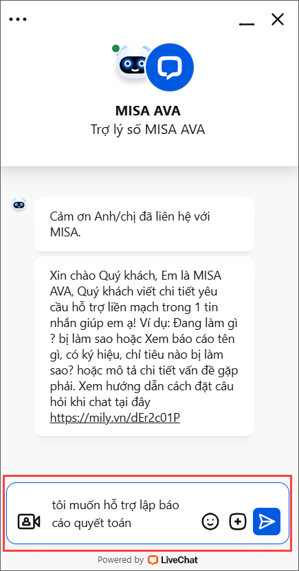 Thông qua Amis Support, khách hàng có thể trò chuyện ngay với Trợ lý số MISA AVA hoặc nhân viên tư vấn để được hỗ trợ kịp thời mọi vấn đề liên quan đến sử dụng phần mềm.