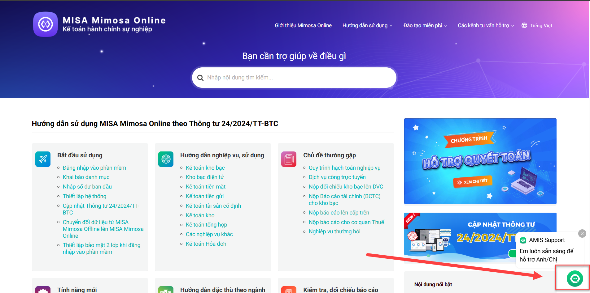 Bước 1: Tại màn hình https://helpihos.misa.vn/ke-toan/, anh/chị chọn vào biểu tượng ? AMIS Support