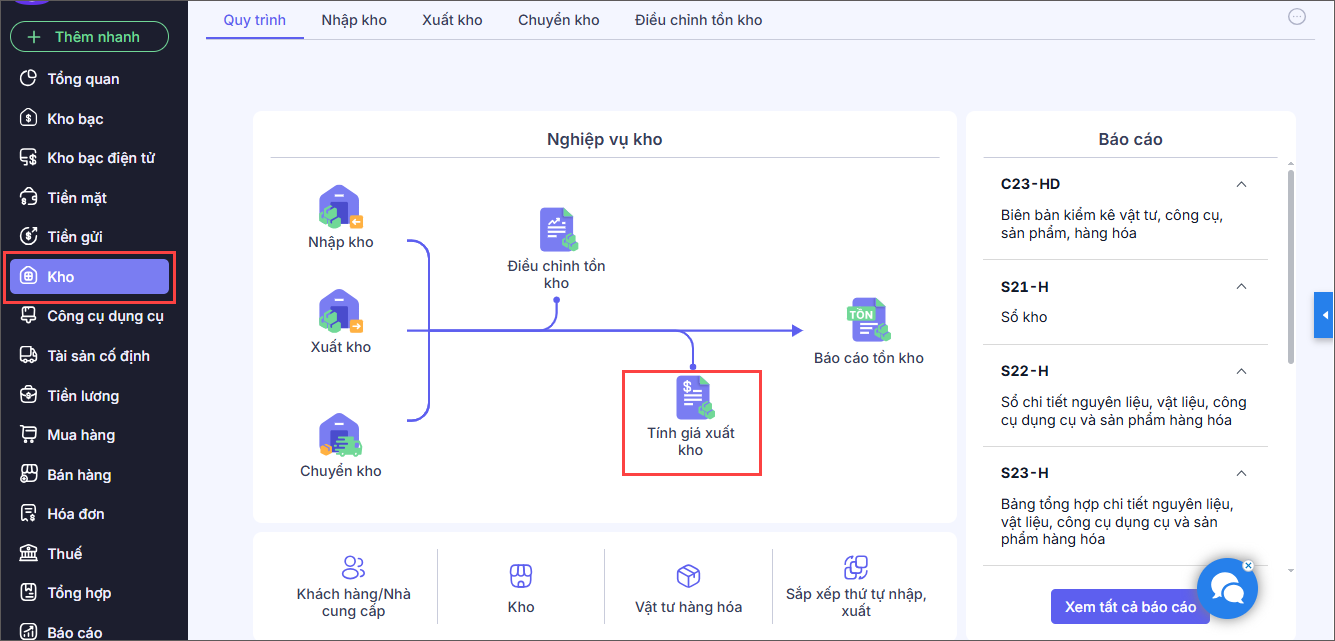 Bước 1: Vào menu Kho\Quy trình, chọn Tính giá xuất kho.