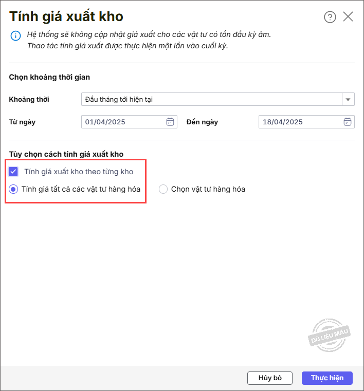 Bước 2: Chọn Khoảng thời gian tính giá xuất kho.