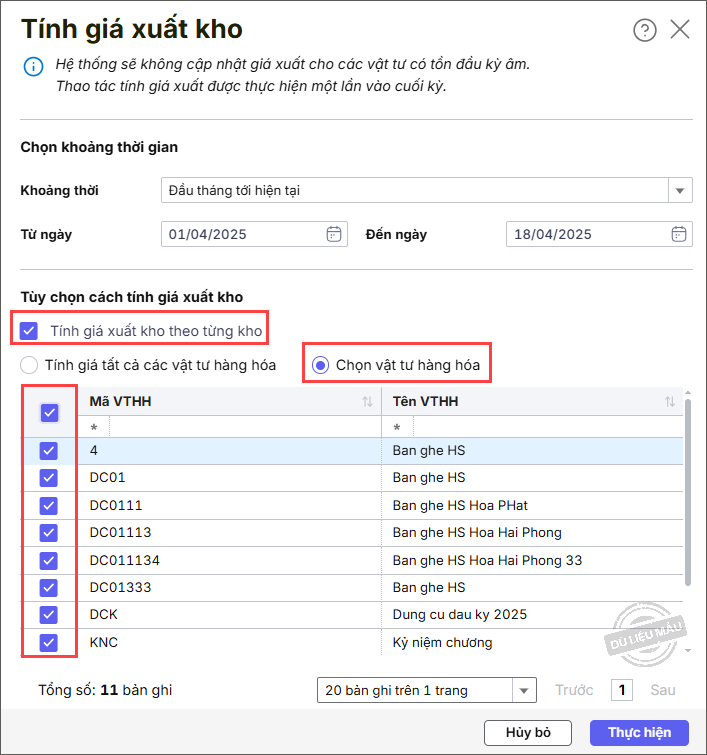 - Tích chọn Tính giá tất cả các vật tư hàng hoá: thực hiện tính giá xuất kho cho tất cả các VTHH, CCDC.