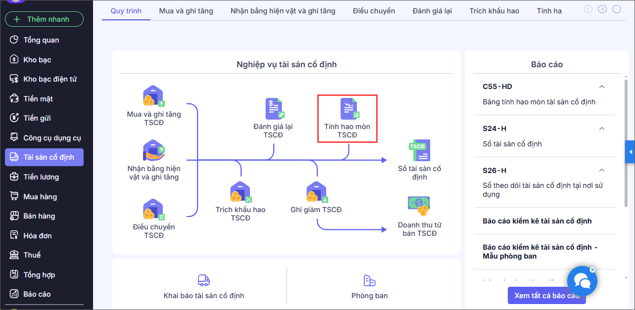 Bước 1. Vào nghiệp vụ Tài sản cố định, chọn Tính hao mòn\Tính hao mòn tài sản cố định.