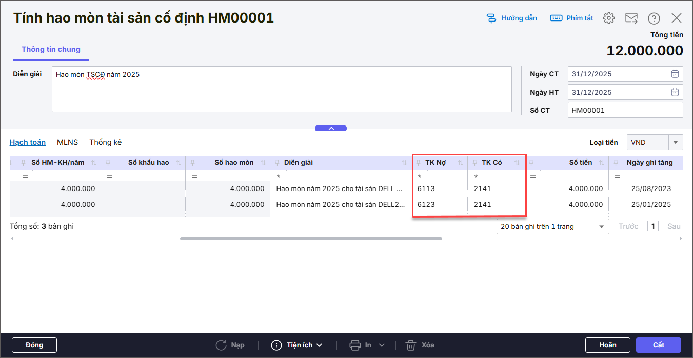 Bước 2. Kiểm tra lại thông tin trên chứng từ Hao mòn tài sản cố định theo phần Định khoản ở trên.