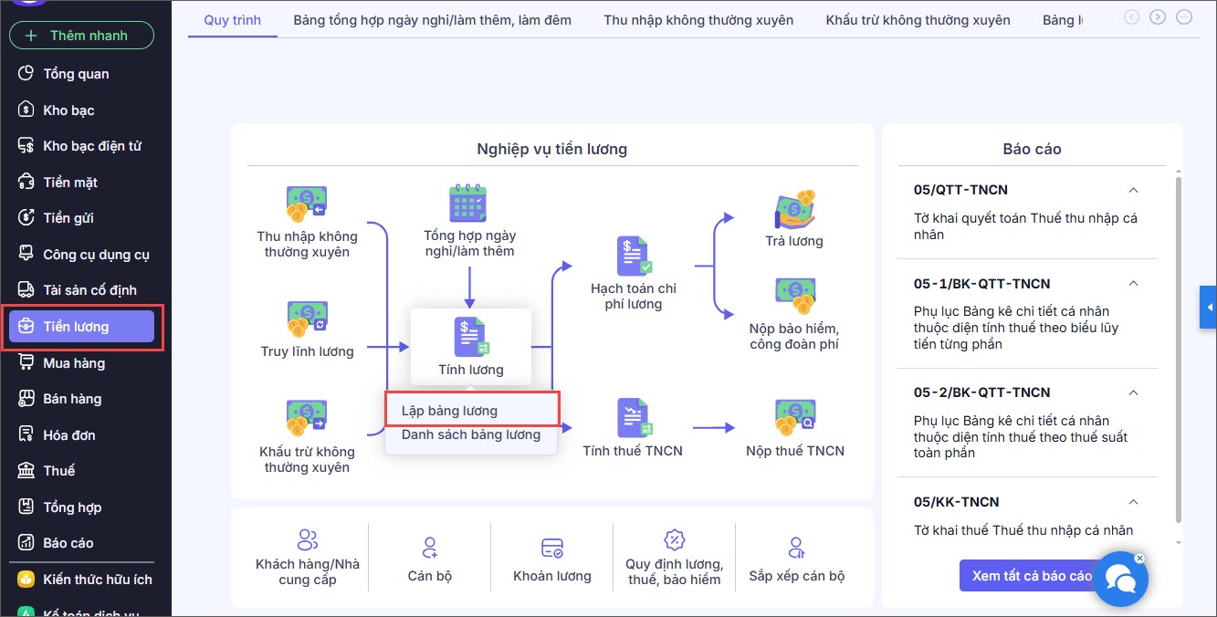 Bước 1: Vào phân hệ Tiền lương, chọn Tính lương/Lập bảng lương.