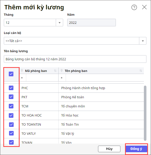 - Tích chọn phòng ban cần tính lương