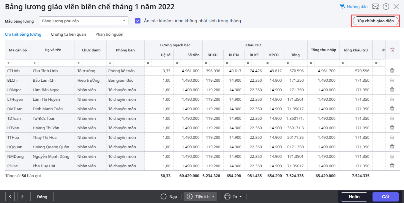 Lưu ý: Anh/chị có thể thiết lập mẫu bảng lương theo nhu cầu của đơn vị bằng cách chọn Tùy chỉnh giao diện.