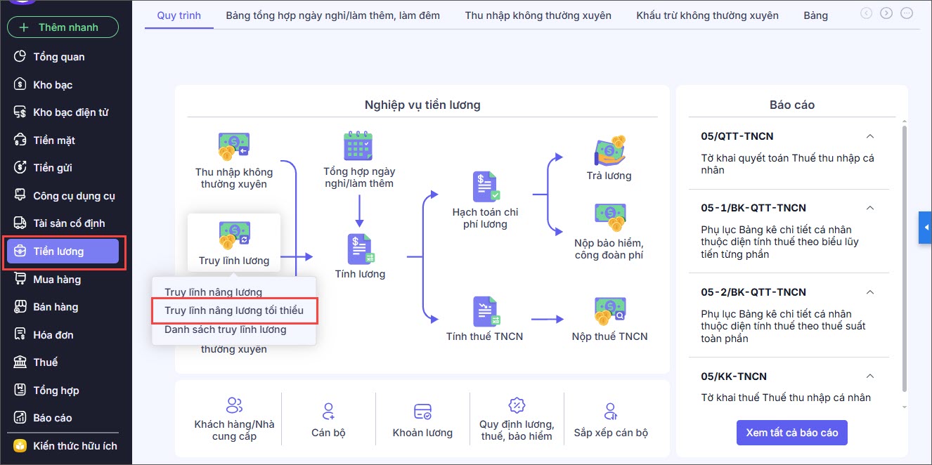 Bước 1: Vào phân hệ Tiền lương, chọn Truy lĩnh lương\Truy lĩnh nâng lương tối thiểu.
