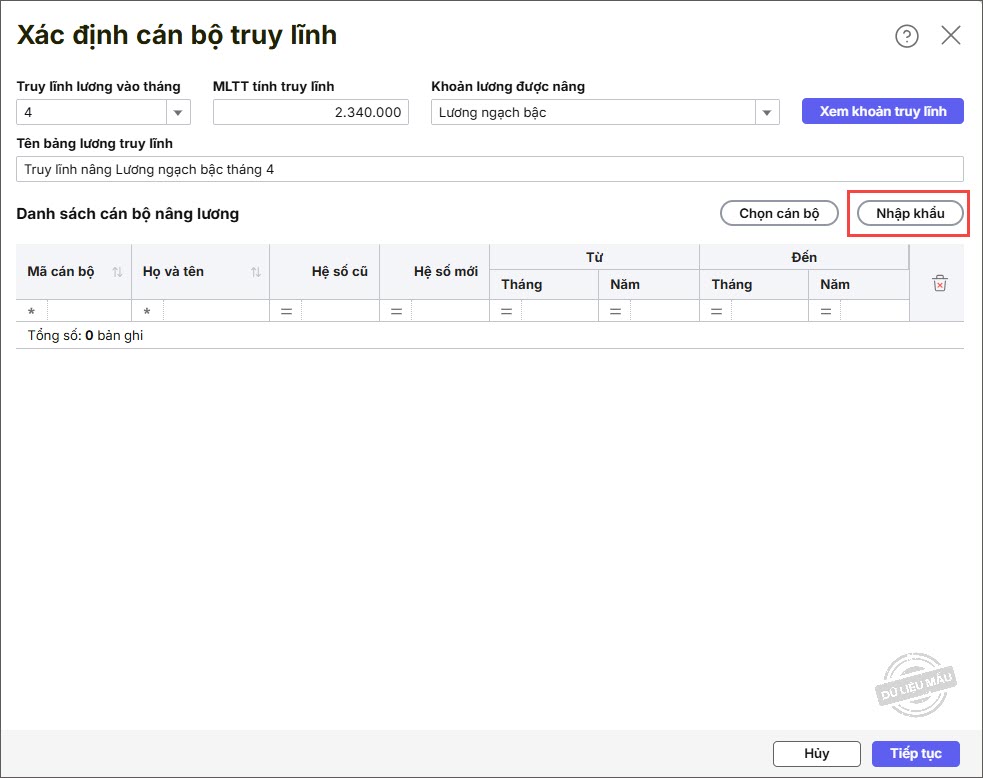 Lưu ý: Có thể nhấn Nhập khẩu để nhập khẩu nhanh file danh sách cán bộ được nâng lương, phụ cấp vào phần mềm. Xem hướng dẫn tại đây
