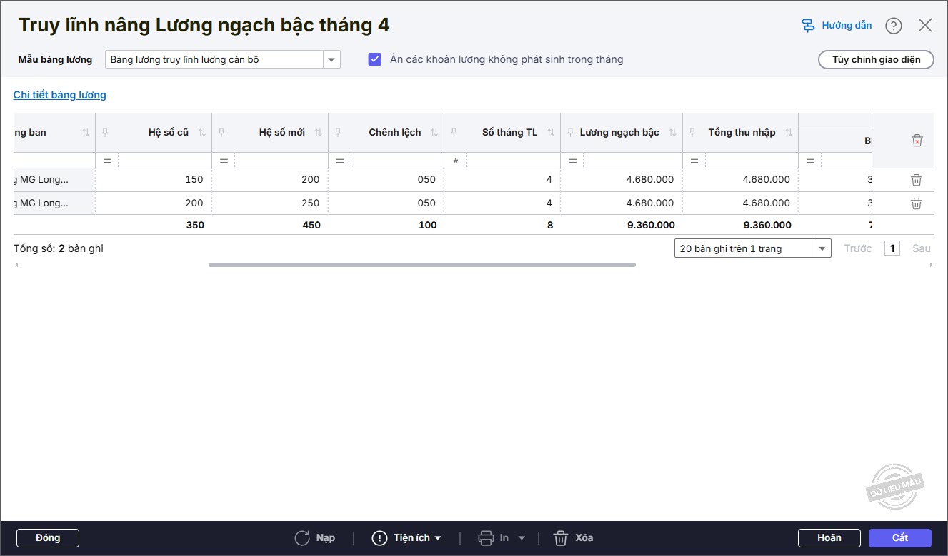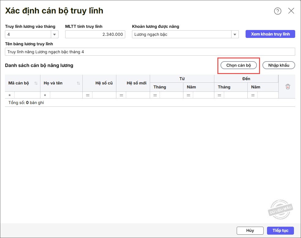 Bước 7: Phần mềm tự động tính Truy lĩnh nâng lương cho các cán bộ được chọn. Nhấn Cất.