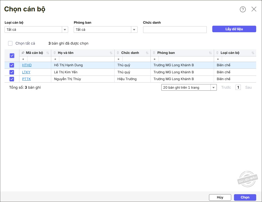 - Chọn Loại cán bộ, Phòng ban, Chức danh, sau đó nhấn Lấy dữ liệu.