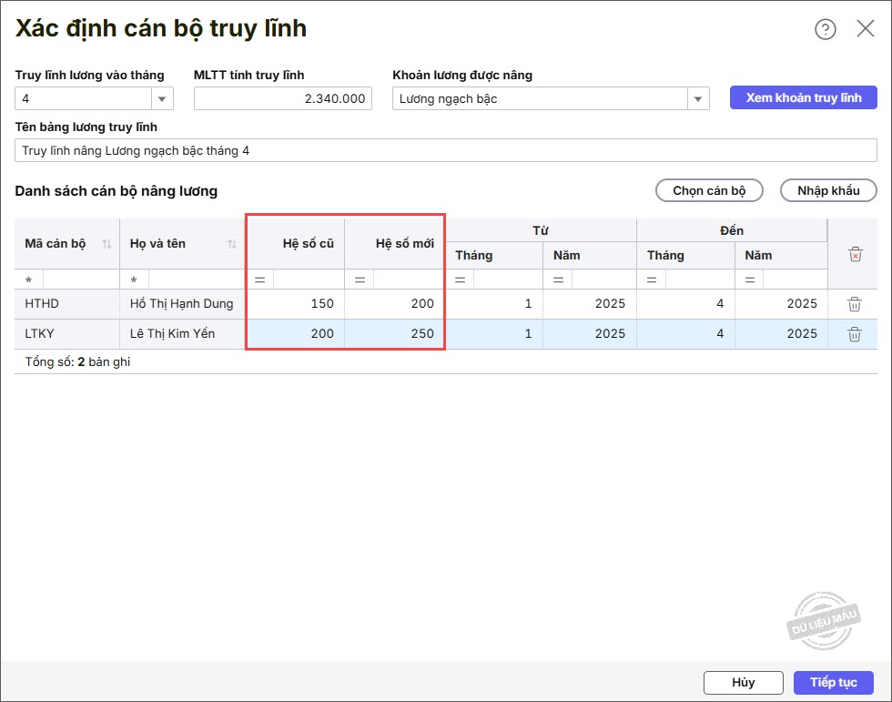 Bước 4: Khai báo Hệ số mới, Hệ số cũ với trường hợp khoản lương được nâng tính theo hệ số, Tỷ lệ cũ, Tỷ lệ mới với trường hợp khoản lương được nâng tính theo Tỷ lệ chi tiết theo từng cán bộ.