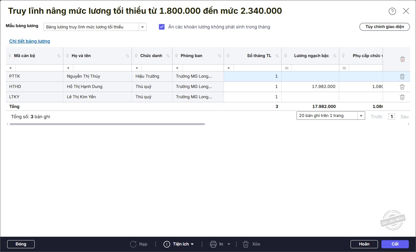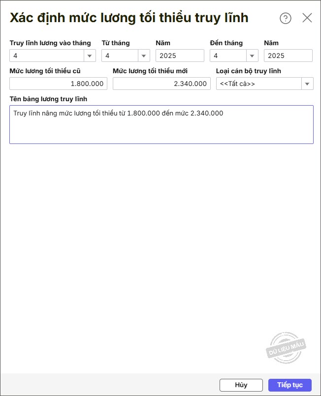 Bước 3: Hệ thống sẽ tự động tính lương truy lĩnh bao gồm tất cả các khoản lương bị ảnh hưởng do thay đổi mức lương tối thiểu.