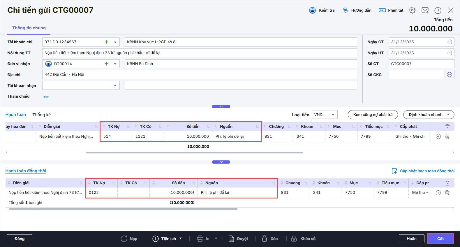 - Phần Hạch toán TK Nợ 514, TK Có 1121: nhập số tiền dương chọn Nguồn, Chương, Khoản, Tiểu mục 7799