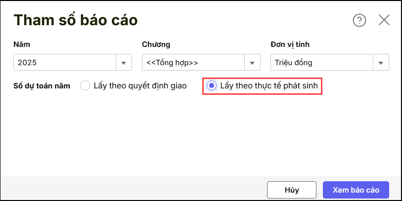Nguyên nhân: Khi in báo cáo, không hiển thị số liệu là do anh/chị chưa tích chọn “Số dự toán năm lấy theo thực tế phát sinh” trong phần tham số báo cáo.