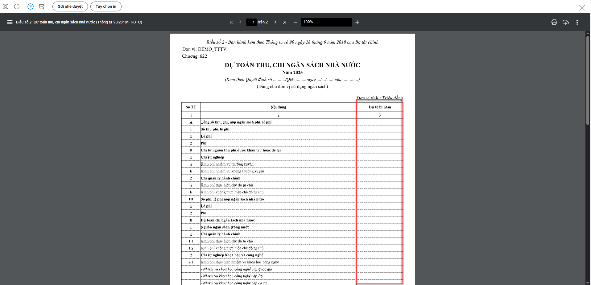 Lưu ý: Khi xem theo cách này thì chỉ hiển thị số liệu trong phần B – Dự toán chi ngân sách nhà nước. Nếu muốn hiển thị cả số liệu trong phần A- Tổng số thu, chi, nộp ngân sách phí, lệ phí thì anh/chị nhập dự toán trên phần mềm theo hướng dẫn tại đây và khi in trong phần tham số báo cáo tích Số dự toán “Lấy theo quyết định giao”