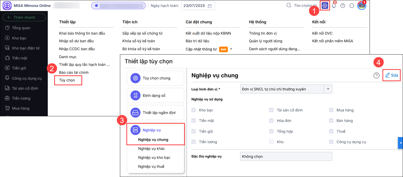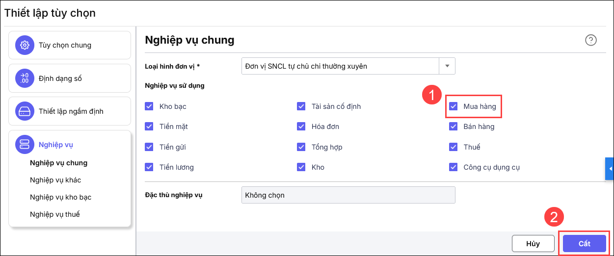 • Vào biểu tượng Bánh răng ⚙ (góc phải phía trên)\Thiết lập\Tùy chọn\Nghiệp vụ\Nghiệp vụ chung.