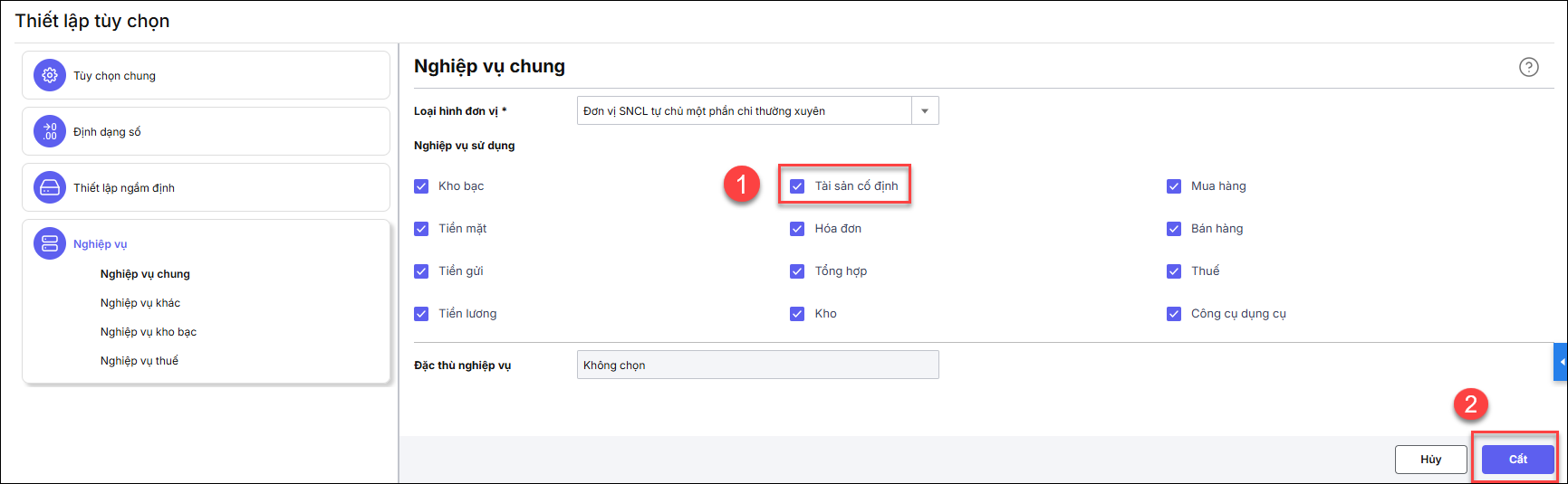 Bước 3: Tại phần Nghiệp vụ sử dụng, tích chọn vào ô Tài sản cố định để kích hoạt phân hệ này.