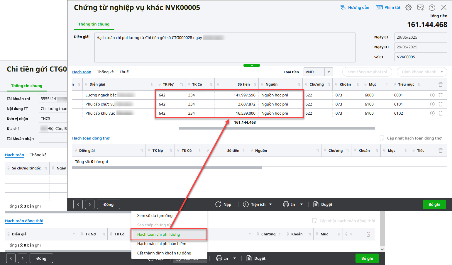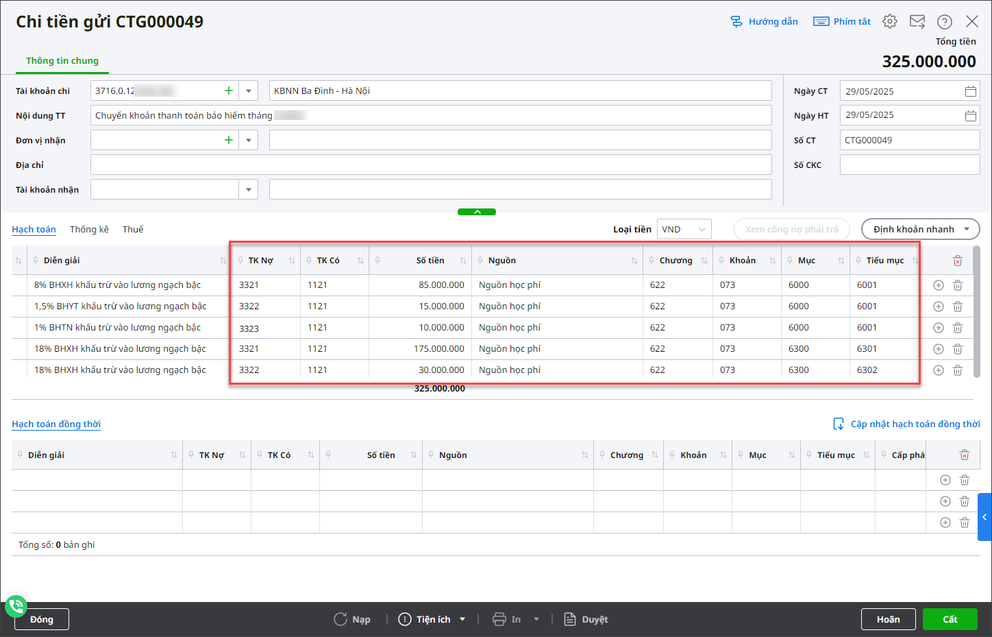 Hướng dẫn chi tiết xem tại đây Bước 2: Khi phát sinh chi tiền lương1. Chuyển lương từ TK kho bạc sang TK ngân hàng để trả lương Thực hiện bước này nếu đơn vị cần chuyển lương từ TK kho bạc => TK ngân hàng của đơn vị => TK ATM của từng cán bộ nhân viên.
