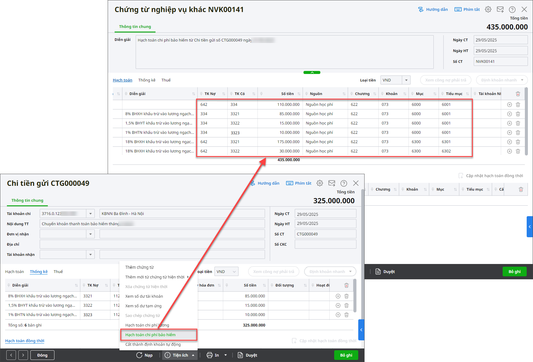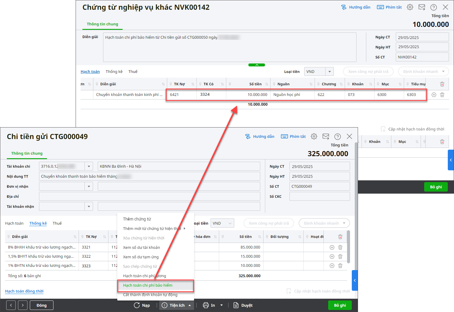 Bước 3: Khi phát sinh chi thanh toán bảo hiểm, kinh phí công đoànBảo hiểm1. Chi thanh toán bảo hiểm: