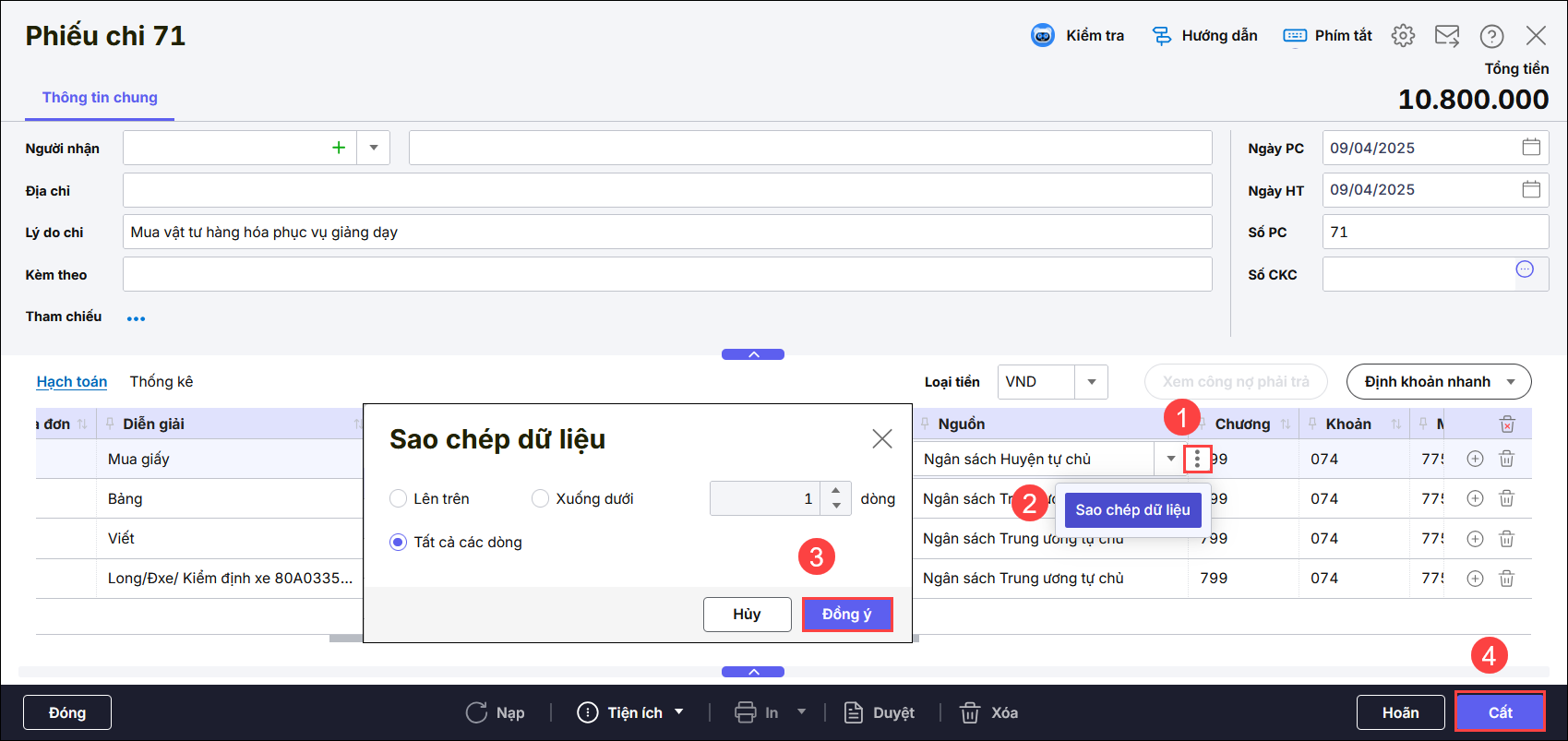 - Nếu chọn Tất cả các dòng phần mềm sẽ sao chép dữ liệu nguồn đó cho tất cả các dòng trên chứng từ.