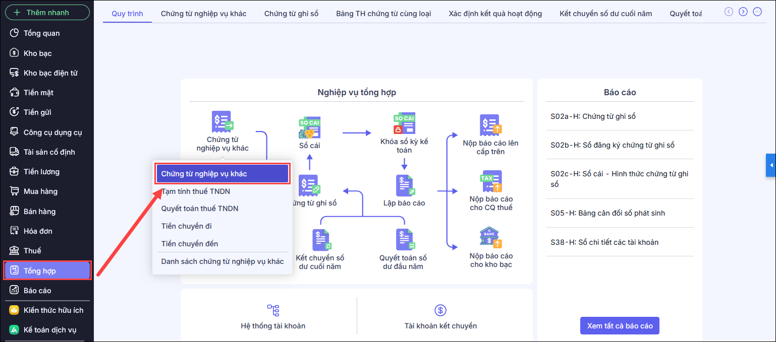 Bước 1: Hạch toán giảm số tiền đã chi từ nguồn học phí, tăng số tiền chi ở nguồn ngân sách1. Vào phân hệ Tổng hợp\Chứng từ nghiệp vụ khác.