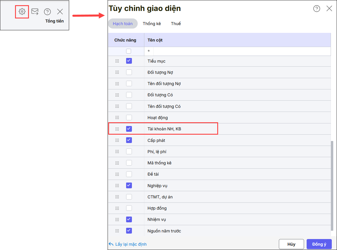 Lưu ý: Nếu không thấy cột Tài khoản NH, KB để chọn, bạn nhấn Chuột phải/tích chọn “Tài khoản NH, KB”/Đồng ý