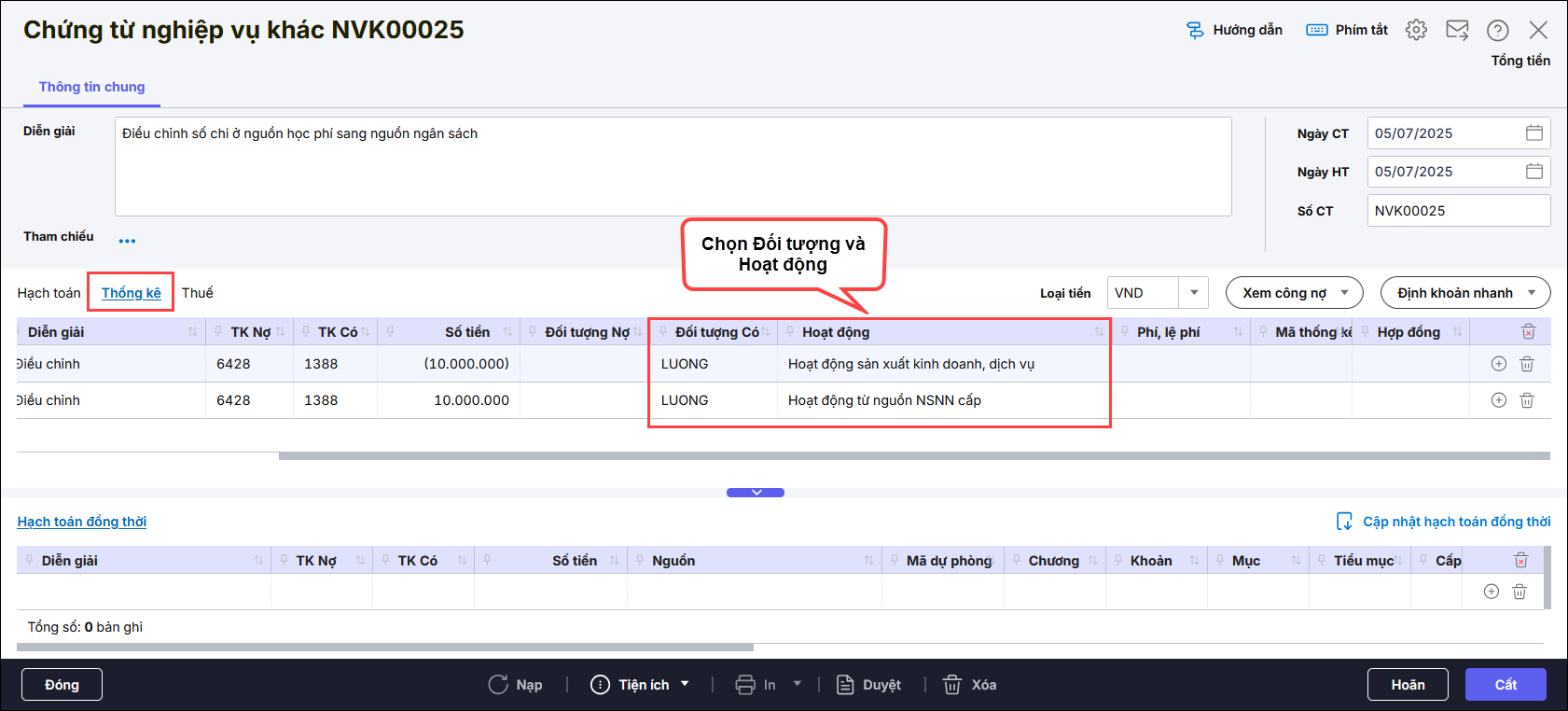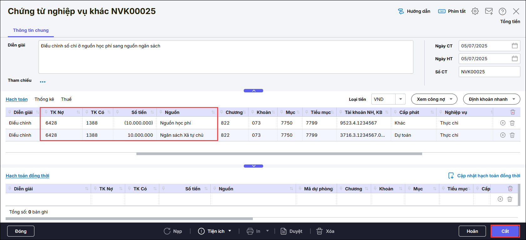 Bước 1: Hạch toán giảm số tiền đã chi từ nguồn học phí, tăng số tiền chi ở nguồn ngân sách