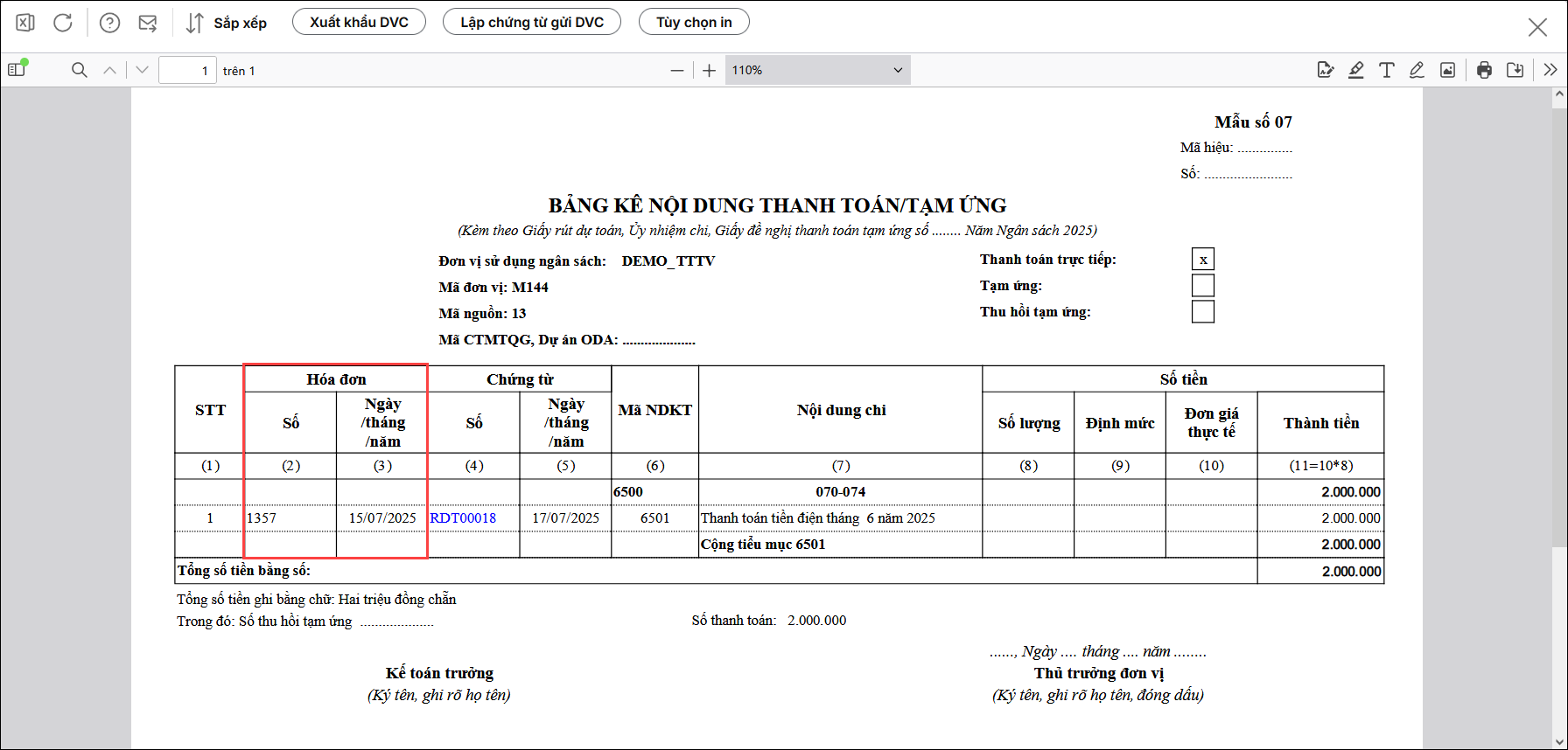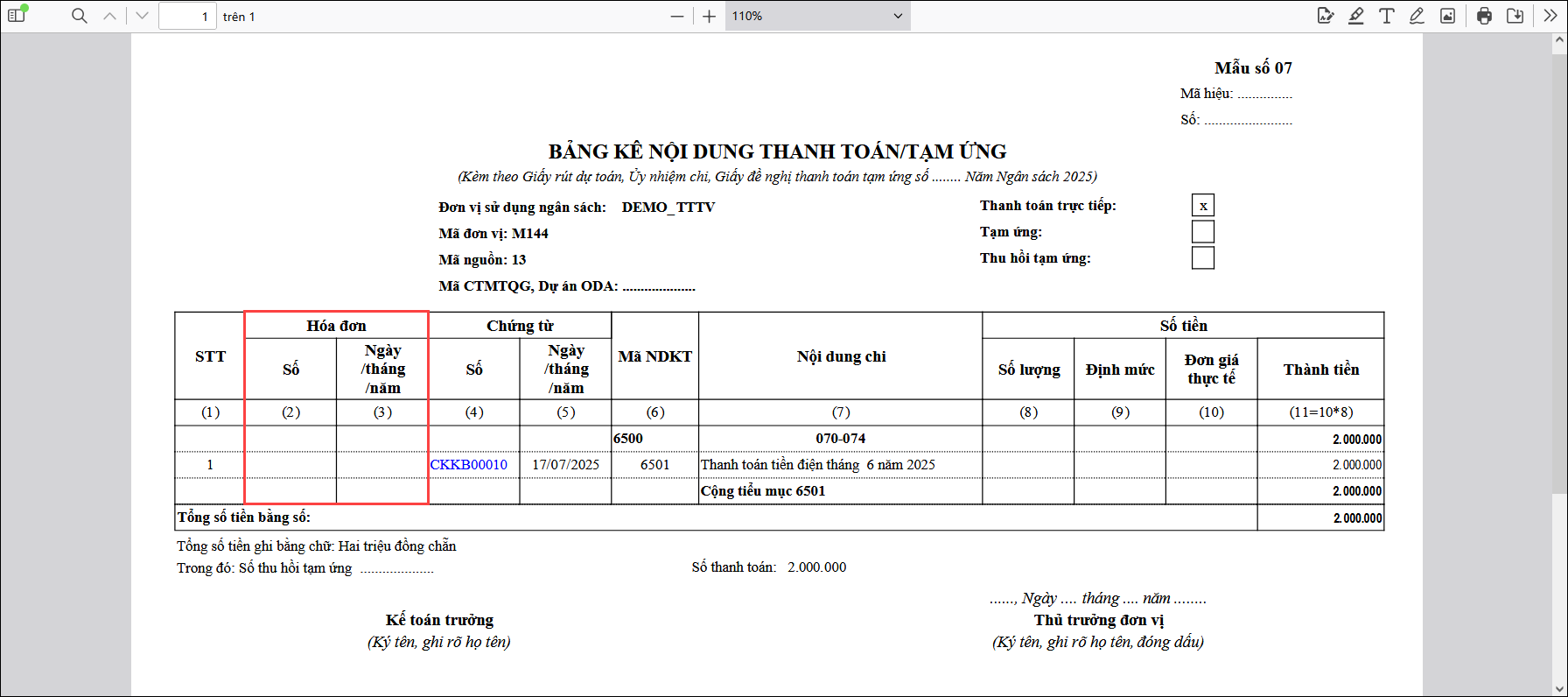 Bài viết này hướng dẫn xử lý khi in Bảng kê nội dung thanh toán/tạm ứng (mẫu số 07) không hiển thị số hóa đơn và ngày hóa đơn