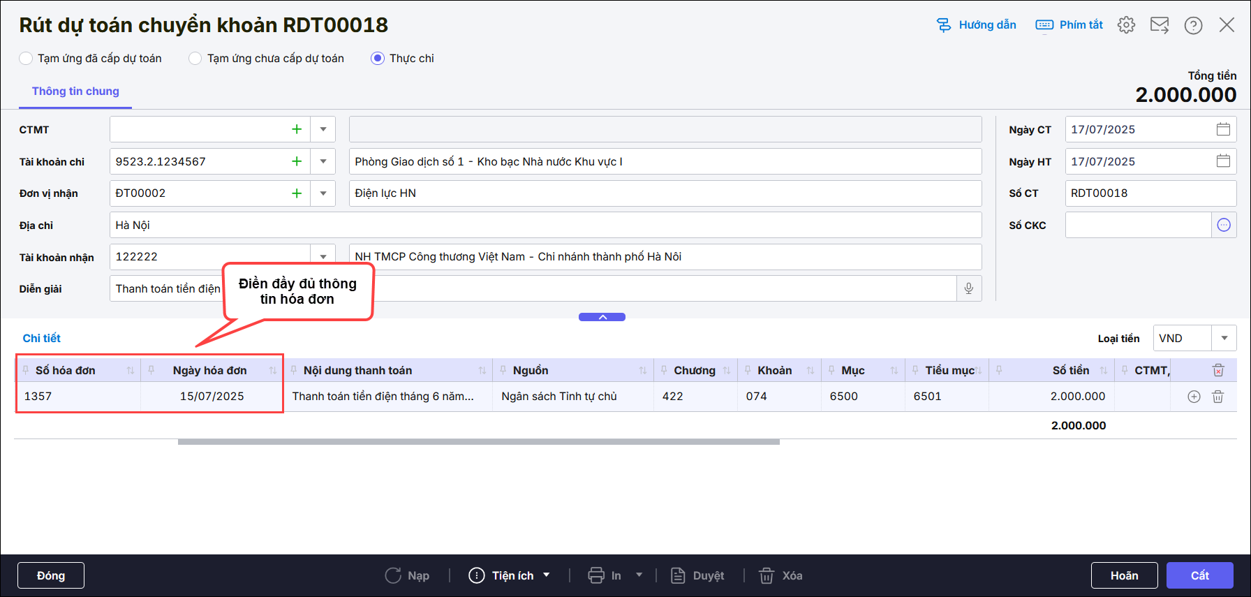 • Nhấn Sửa nếu chứng từ là giấy rút, Nhấn Bỏ ghi /Sửa nếu là chứng từ khác, điền bổ sung các cột thiếu thông tin: Số hóa đơn, Ngày hóa đơn