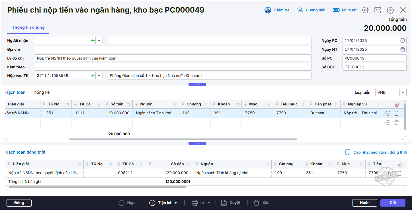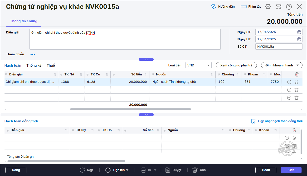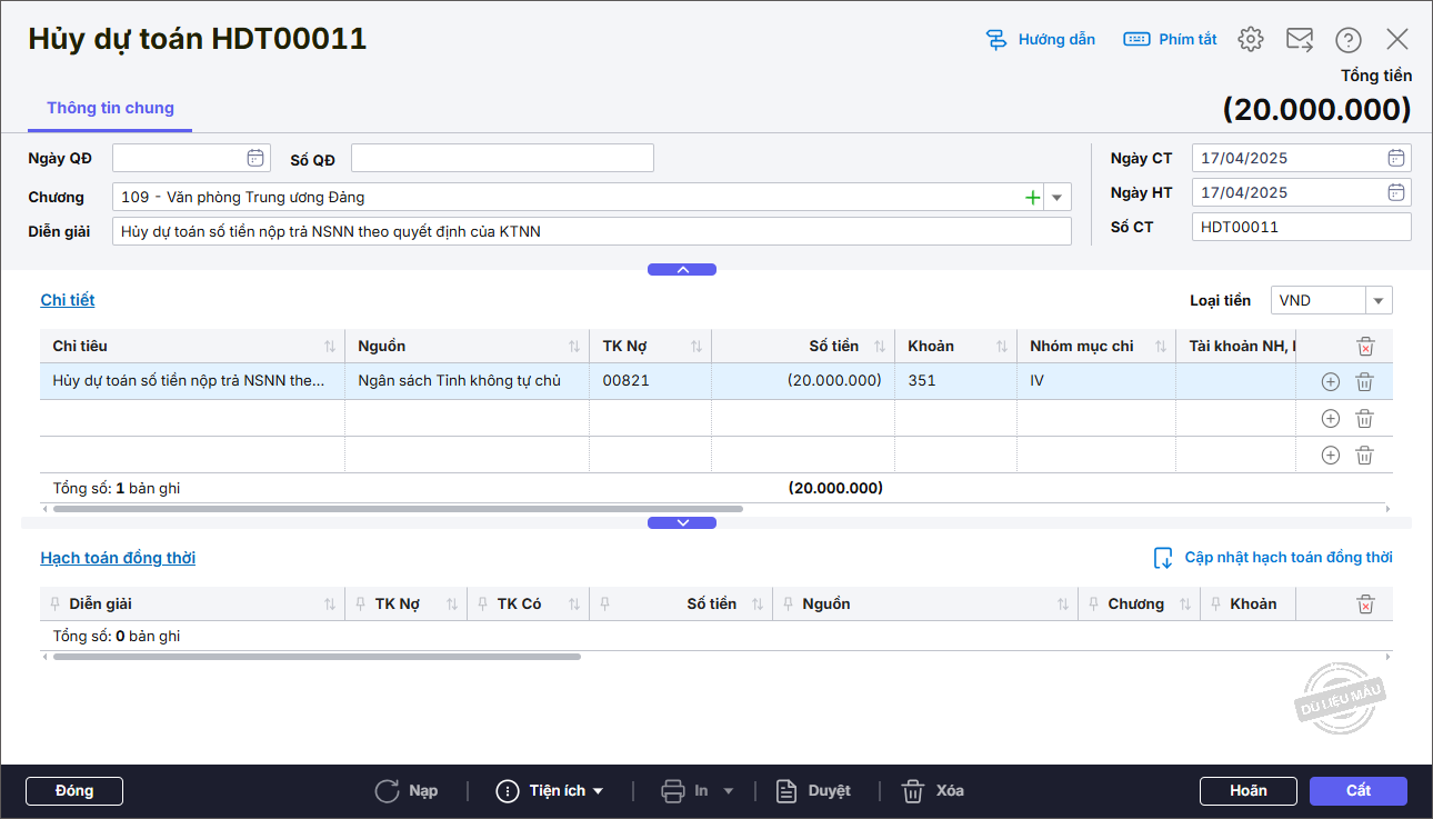 - Phần mềm mặc định sẵn TK Nợ 00821, 00822 tùy theo tính chất nguồn, nhập số tiền huỷ dự toán (số tiền âm).