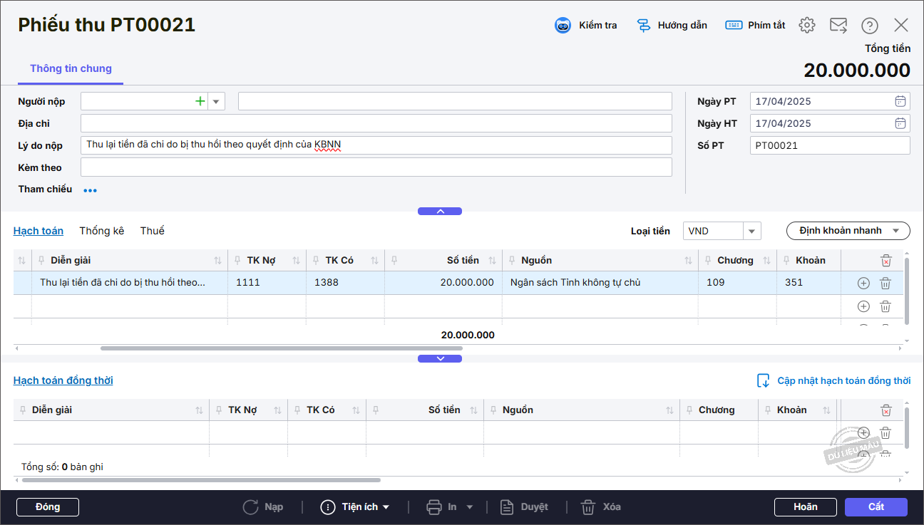 3. Tab Hạch toán: nhập TK Nợ 1111, TK Có 1388, nhập Số tiền.