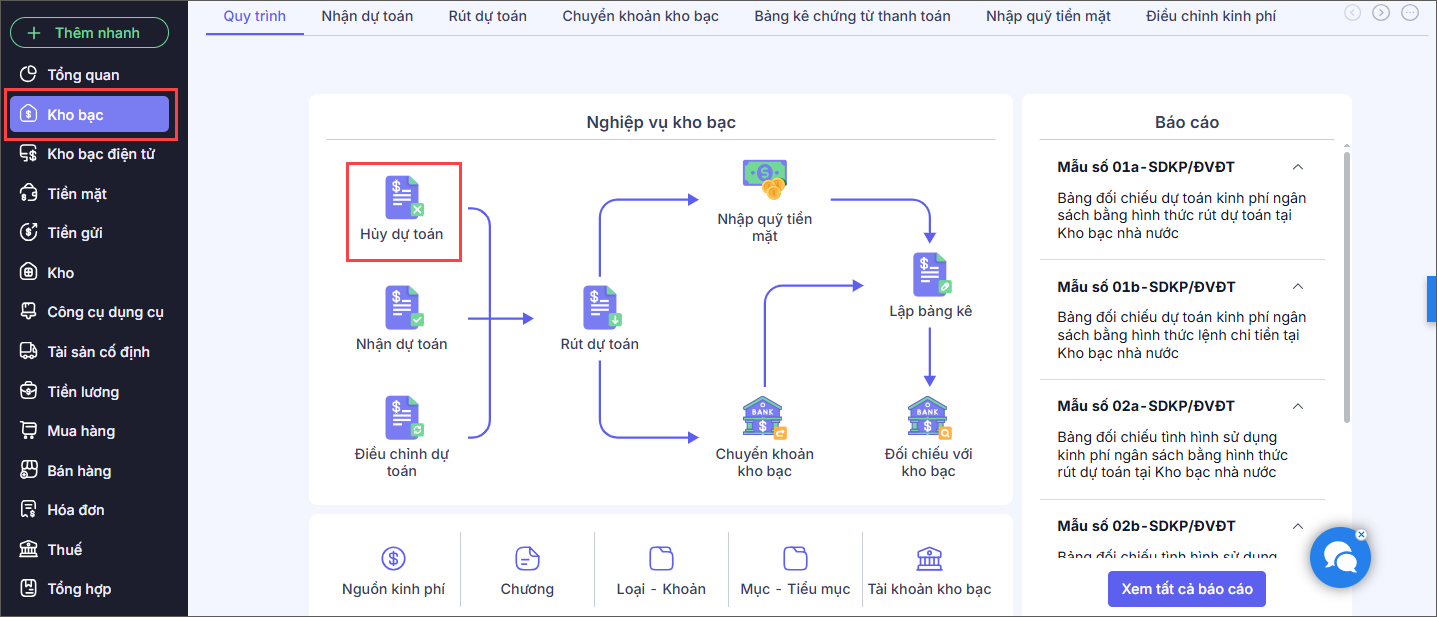 1. Vào nghiệp vụ Kho bạc\Huỷ dự toán.