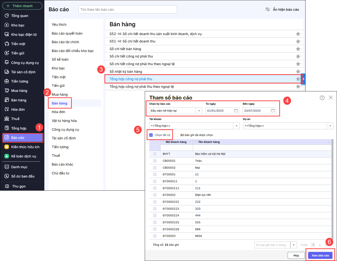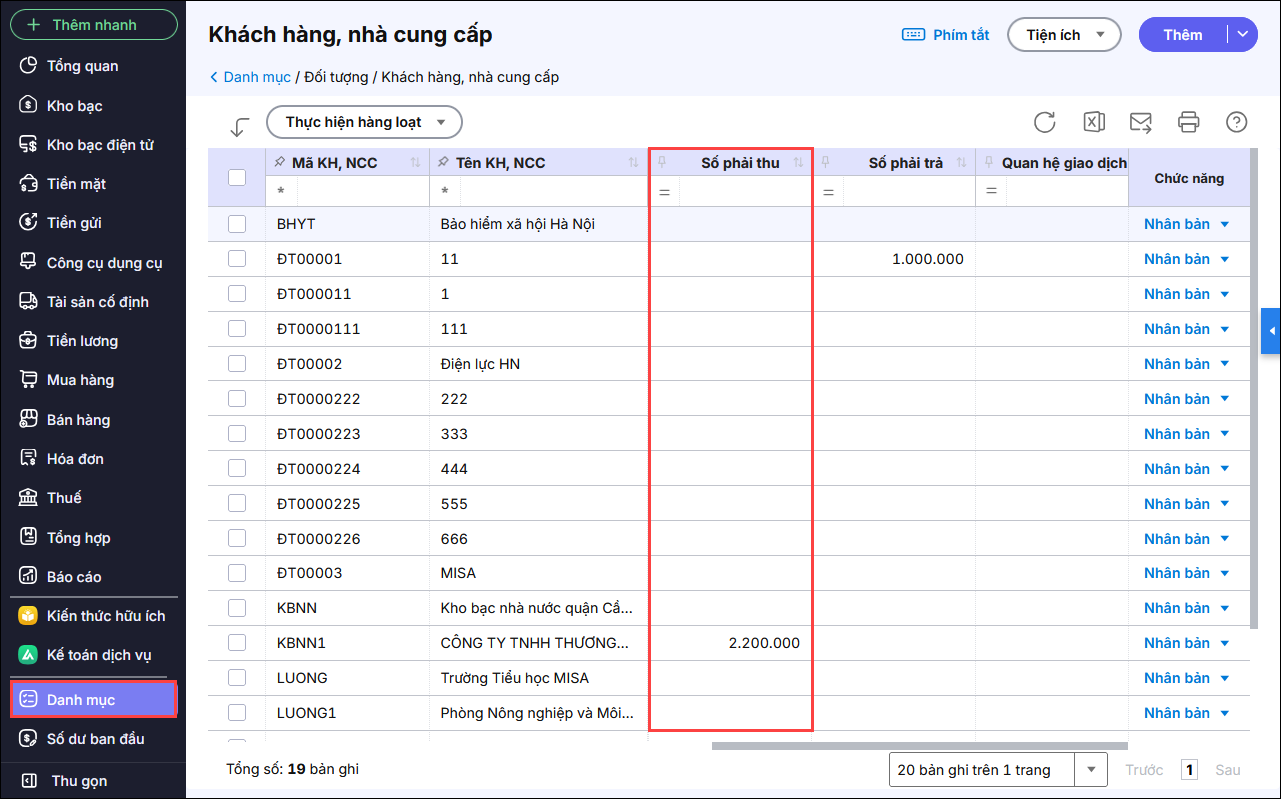 Cách tra cứu số dư nợ phải thu khách hàng thì làm thế nào? Mục lục 1. Tổng quan2. Cách thực hiệnCách 1: Xem Số phải thu tại danh mục Khách hàng, Nhà cung cấpCách 2: Xem Số phải thu tại báo cáo Tổng hợp công nợ phải thu 1. Tổng quan Bài viết nhằm hướng dẫn anh/chị tra cứu nhanh số dư công nợ phải thu khách hàng để báo cáo thủ trưởng đơn vị. 2. Cách thực hiện Để xem được thông tin số dư công nợ đến hiện tại, thực hiện theo 2 cách sau: Cách 1: Xem Số phải thu tại danh mục Khách hàng, Nhà cung cấp Vào menu Danh mục, chọn Khách hàng, NCC Kéo thanh ngang để tìm đến cột Số phải thu. Tại đây chương trình hiển thị số dư công nợ của các khách hàng mà đơn vị theo dõi. Cách 2: Xem Số phải thu tại báo cáo Tổng hợp công nợ phải thu Vào menu Báo cáo, chọn Bán hàng\ Tổng hợp công nợ phải thu Chọn thời gian từ ngày đến ngày và tích chọn đối tượng cần xem. Lượt xem: 280 Cập nhật 11/11/2025 Bài viết này hữu ích chứ? Có Không Bài viết liên quan Làm thế nào để hạch toán chứng từ bán hàng bằng ngoại tệ? Hướng dẫn in sổ S52-H: Sổ chi tiết doanh thu sản xuất kinh doanh, dịch vụ Hướng dẫn in sổ S51-H: Sổ chi tiết doanh thu Bán hàng Làm thế nào khi không thấy phân hệ bán hàng trên giao diện phần mềm? Tôi muốn quản lý công nợ phải thu chi tiết theo từng dự án thì làm thế nào? Giải đáp miễn phí qua facebookNếu bạn vẫn còn thắc mắc hãy đăng câu hỏi vào cộng đồng MISA qua facebook để được giải đáp miễn phí và nhanh chóngĐĂNG BÀI NGAY