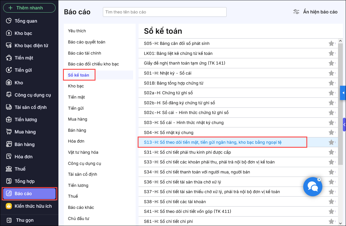Bước 1: Vào Báo cáo\Sổ kế toán\S13-H – Sổ theo dõi tiền mặt, tiền gửi bằng ngoại tệ.