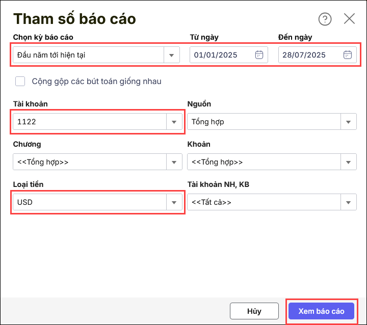 Bước 2: Chọn tham số báo cáo: