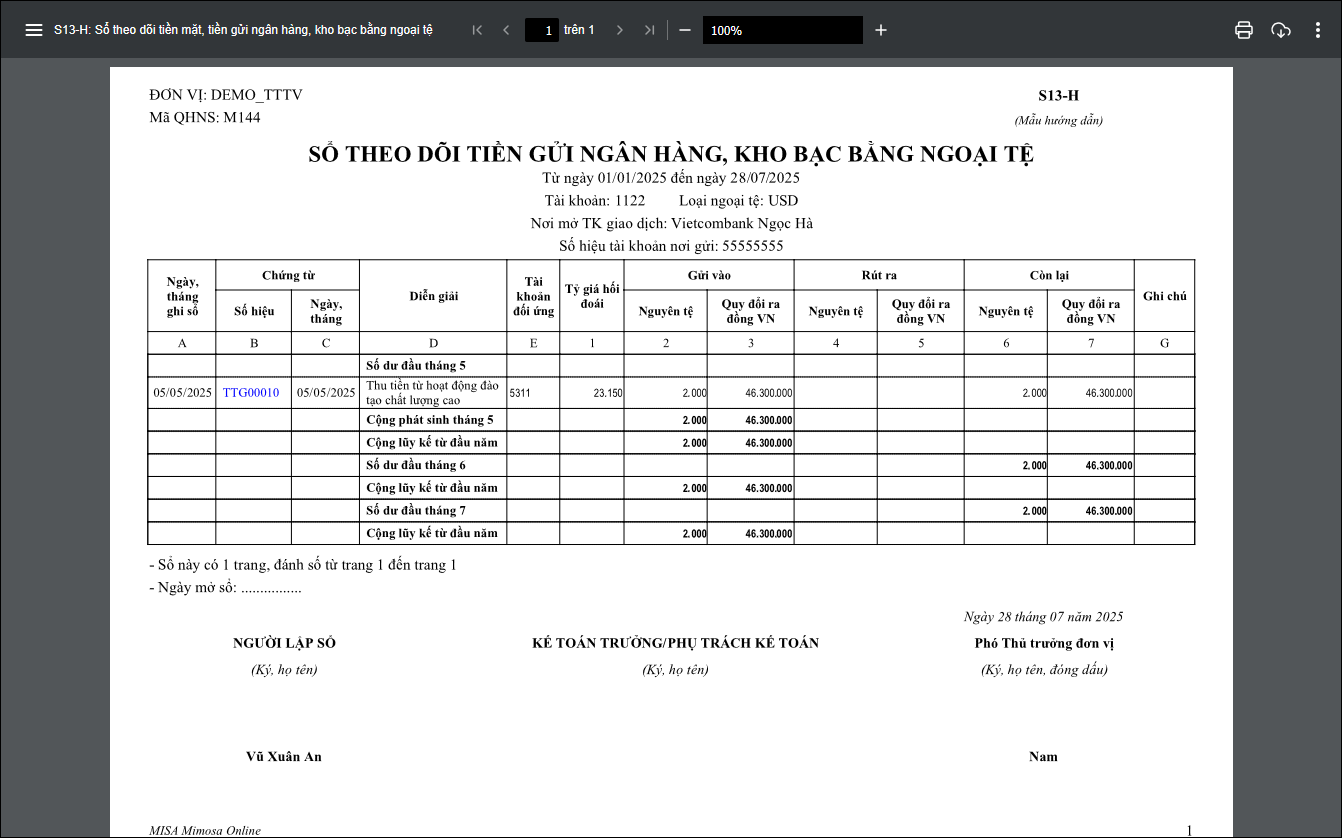 Bài viết này hướng dẫn cách xem Sổ theo dõi tiền gửi bằng ngoại tệ (S13-H) trên phần mềm.