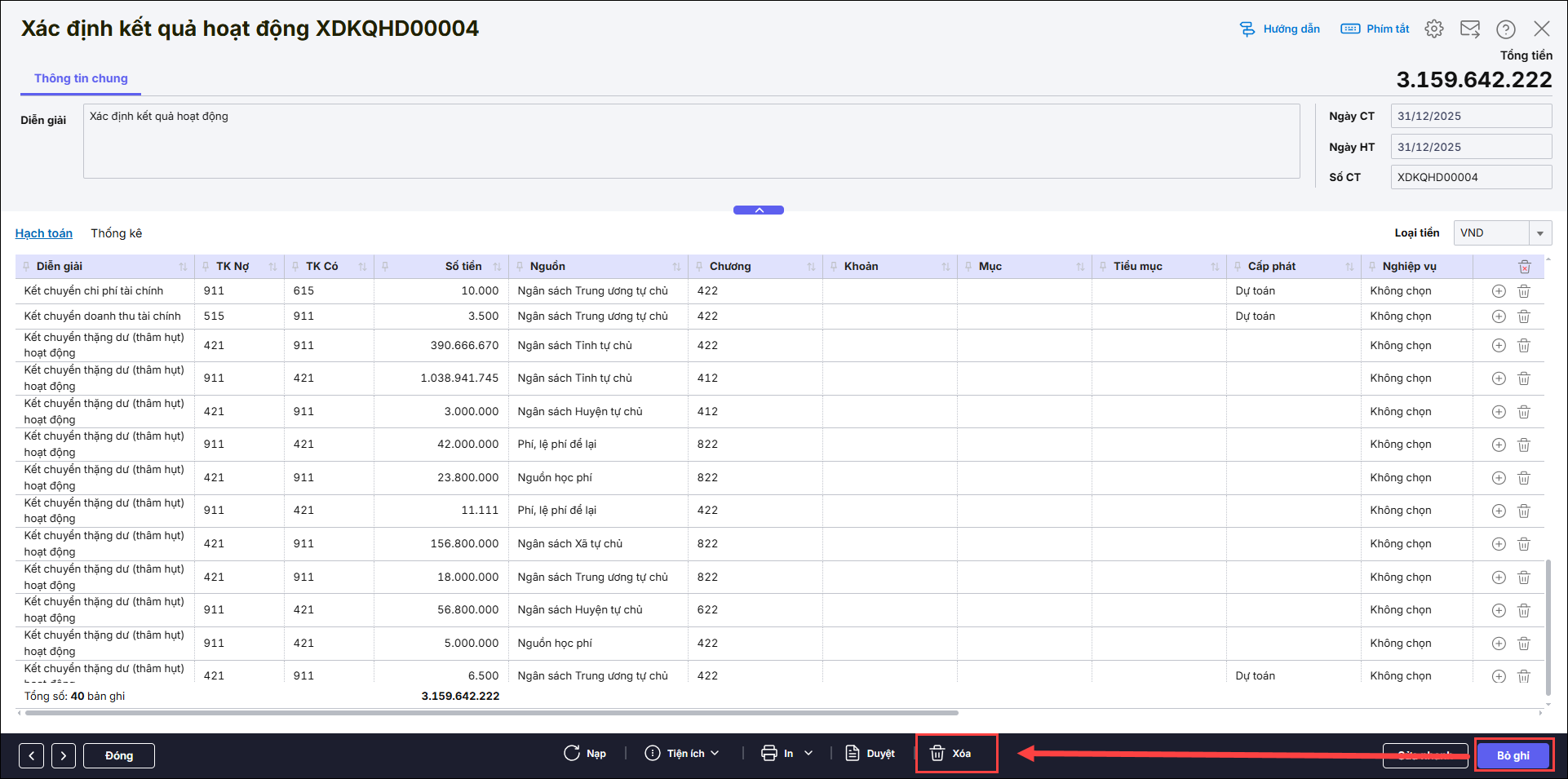 Bước 1: Xóa chứng từ Xác định kết quả hoạt động đã lập.
