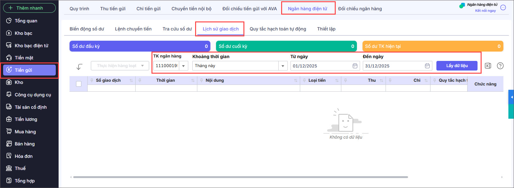 Bước 2: Chọn số tài khoản ngân hàng, khoảng thời gian cần tra cứu và nhấn Lấy dữ liệu.