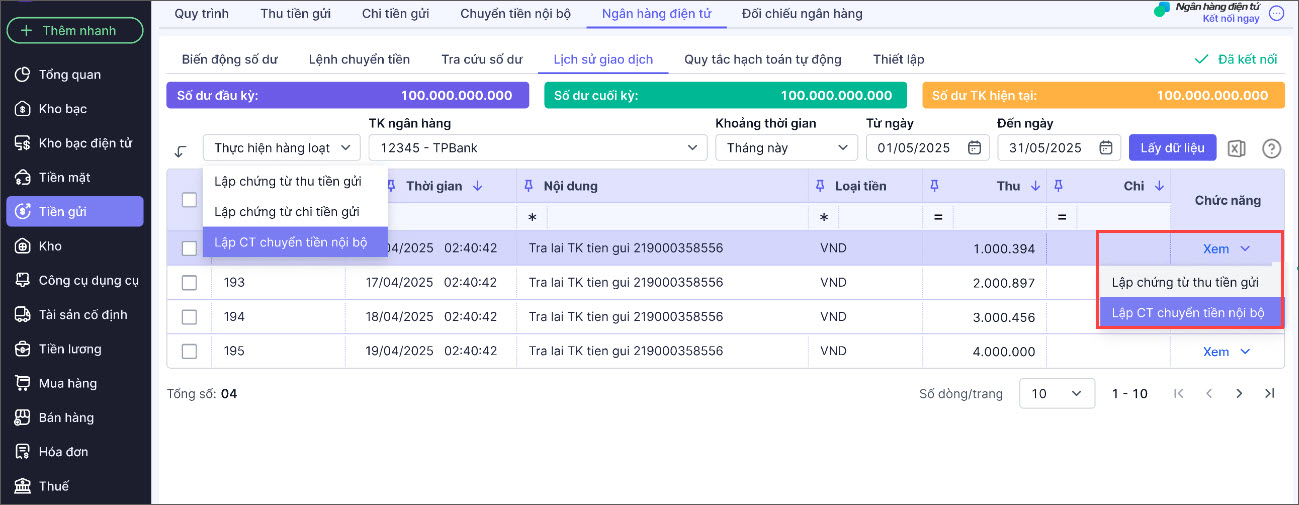 Bước 3: Để lập chứng từ thu/chi tiền gửi, chuyển tiền nội bộ cho các giao dịch này thì làm như sau: