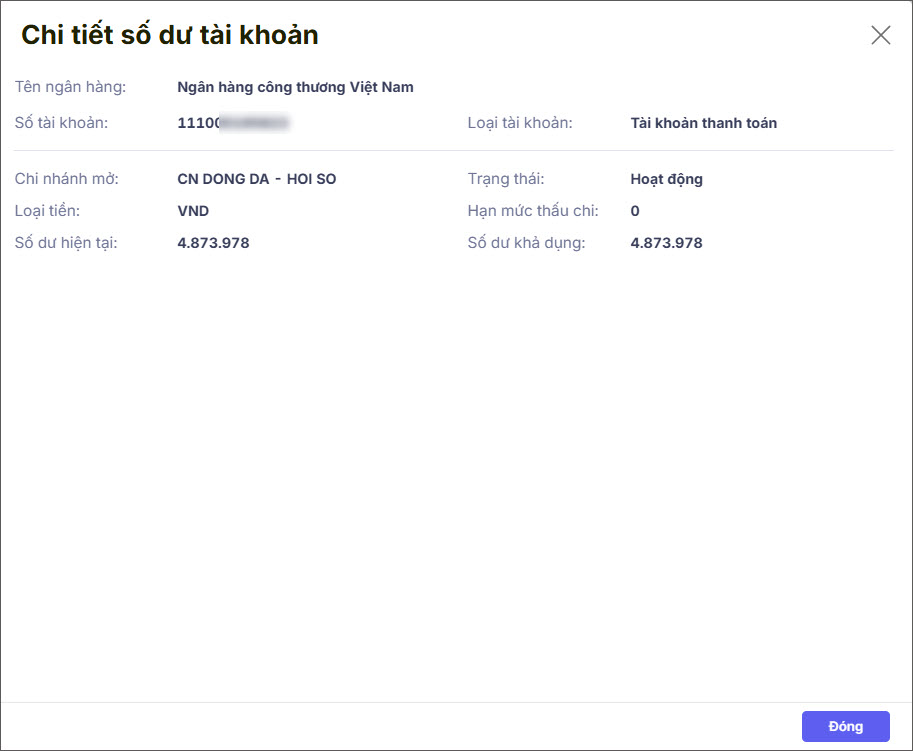 => Phần mềm hiển thị chi tiết số dư tài khoản như sau:
