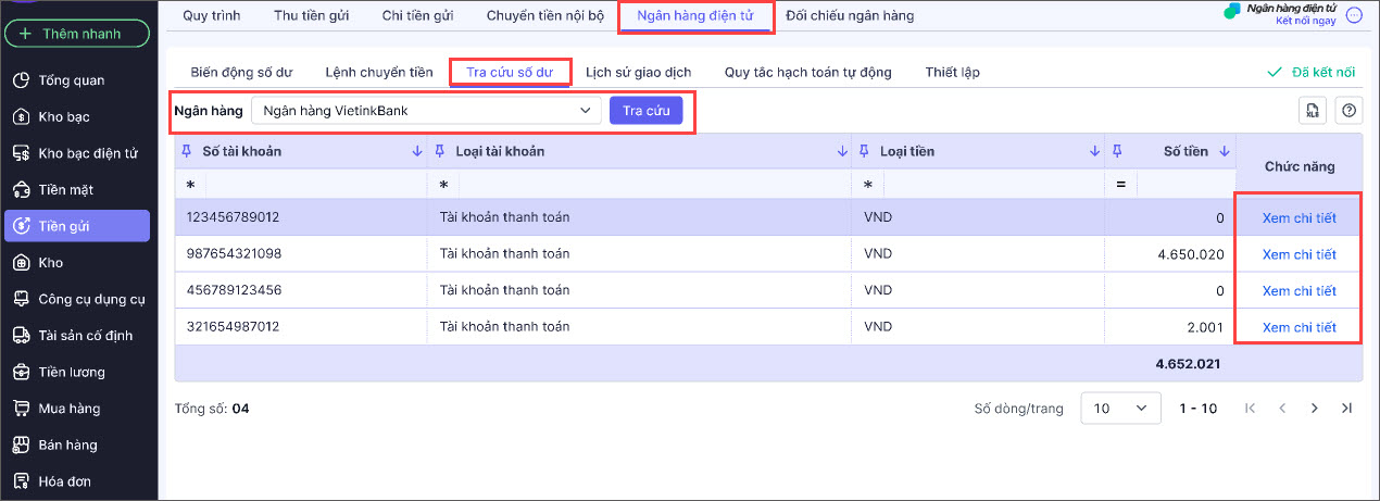 • Kết nối với ngân hàng điện tử mở số tài khoản muốn tra cứu (Xem hướng dẫn kết nối tại đây).