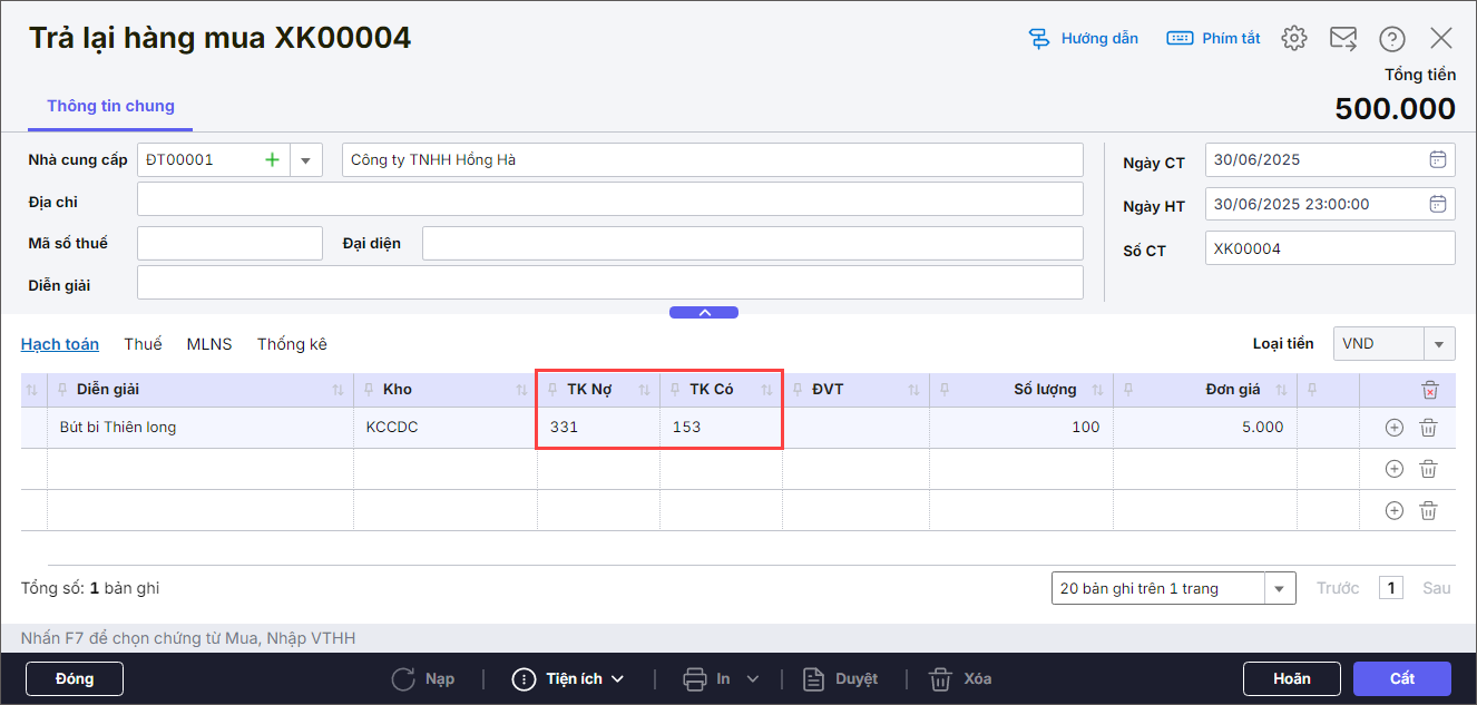 Bước 2. Khai báo chứng từ Trả lại hàng mua: