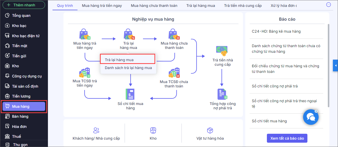 Bước 1. Vào phân hệ Mua hàng, chọn Trả lại hàng mua.