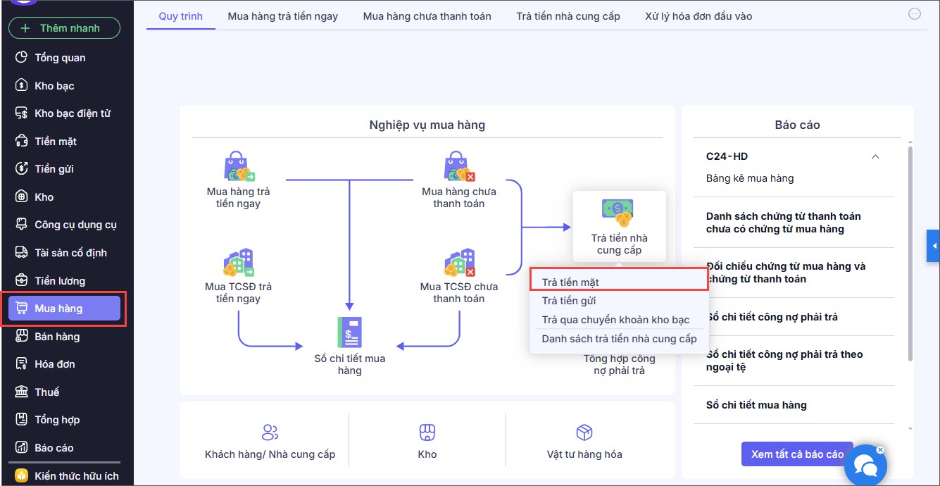 Bước 1: Vào nghiệp vụ Mua hàng\Quy trình\Trả tiền nhà cung cấp, chọn hình thức anh/chị trả Trả tiền mặt hoặc Trả tiền gửi hoặc Trả qua chuyển khoản kho bạc. Ví dụ: Trả tiền mặt.