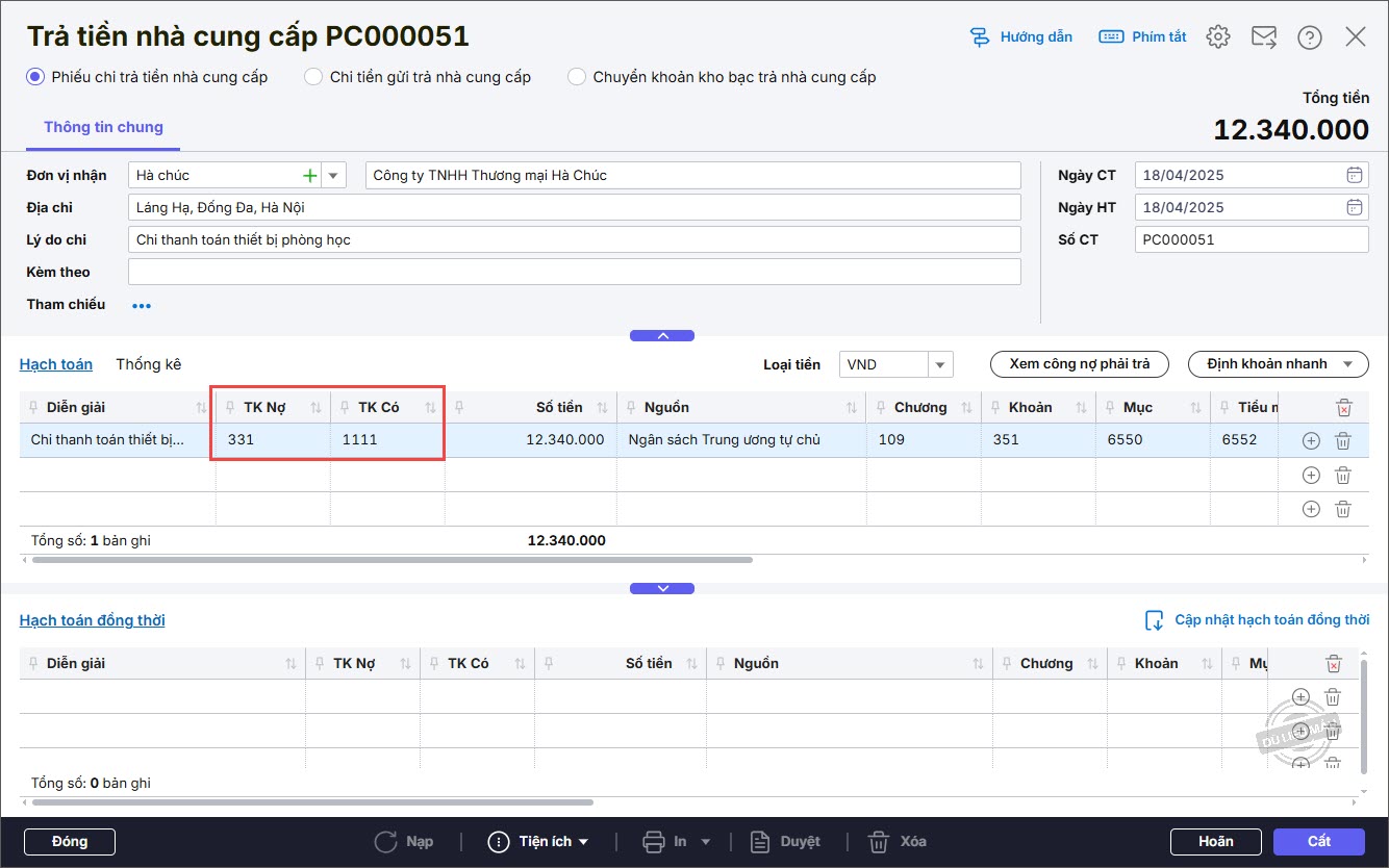 Bài viết hướng dẫn hạch toán và thao tác trả tiền nhà cung cấp bằng tiền mặt, tiền gửi hoặc chuyển khoản kho bạc trong trường hợp anh/chị theo dõi mua hàng chi tiết theo từng mặt hàng , đảm bảo phản ánh đúng công nợ và nguồn kinh phí giúp quản lý, đối chiếu và quyết toán chính xác các khoản chi mua hàng