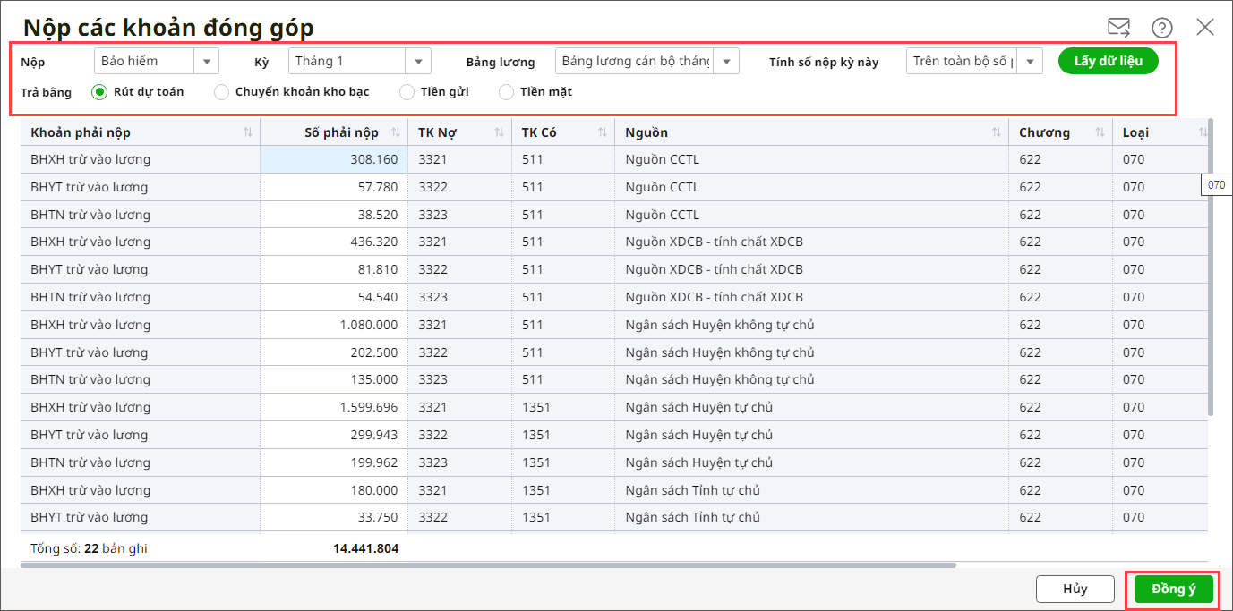 Kể từ phiên bản R2: Trên màn hình Nộp bảo hiểm, công đoàn phí, bổ sung thêm lựa chọn trả bằng rút dự toán khi nộp bảo hiểm.